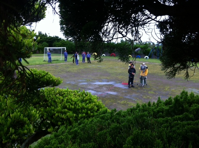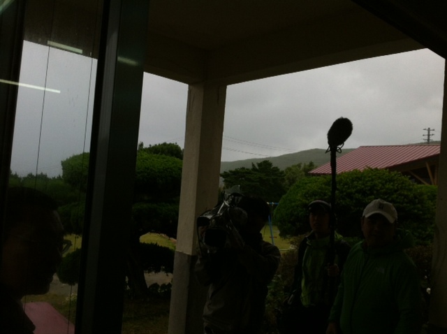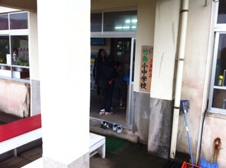 竹島中学校には島のみなさん、生徒さんがぞくそくと集まります。取材陣も、待っている。しかし、たったいま、ざーーっと、雨!!いっせいに校内に避難。