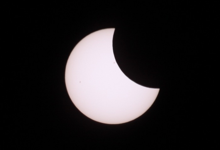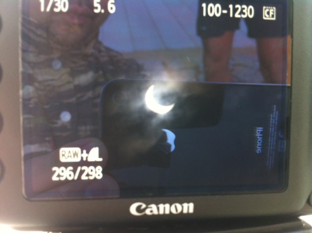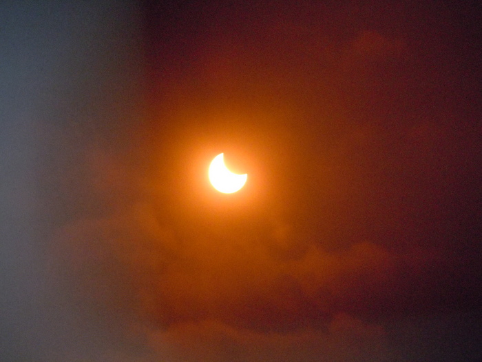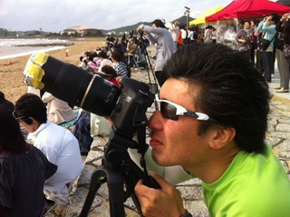 あたりがこころなしか涼しくなってきました。これは、太陽が欠けはじめているからだとか!もうすぐ黒点も欠けに飲み込まれそう。金環日食の開始まで30分くらい!