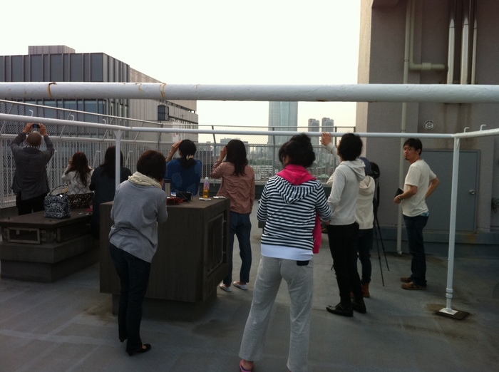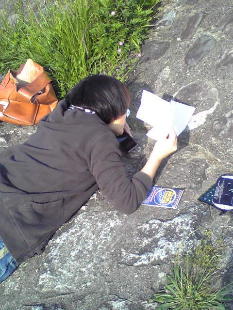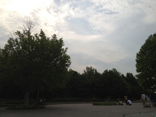 カワモトです。僕のiphoneでは、これが限界でした。朝の散歩を楽しんでいる人、通勤中の人、そして多くのハトといっしょに日食を観測しております。