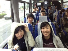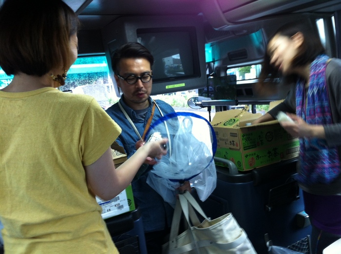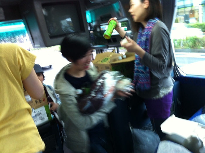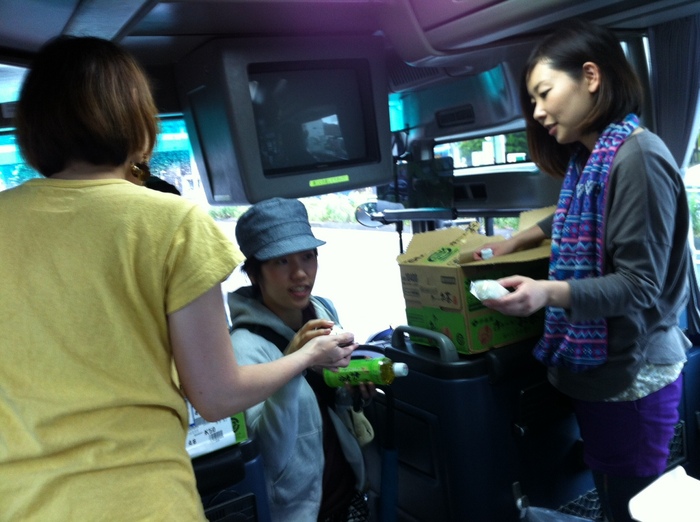 バスに乗ってますよー。 配られているのは、おむすびと、お茶です。 棟廣が持ってるのは、虫捕り網です。