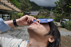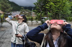 おお、それは日食グラス! そうです、今日は天文学的には 日食よりもレアな 「太陽の上を金星が横切る日」! どう? 見える?