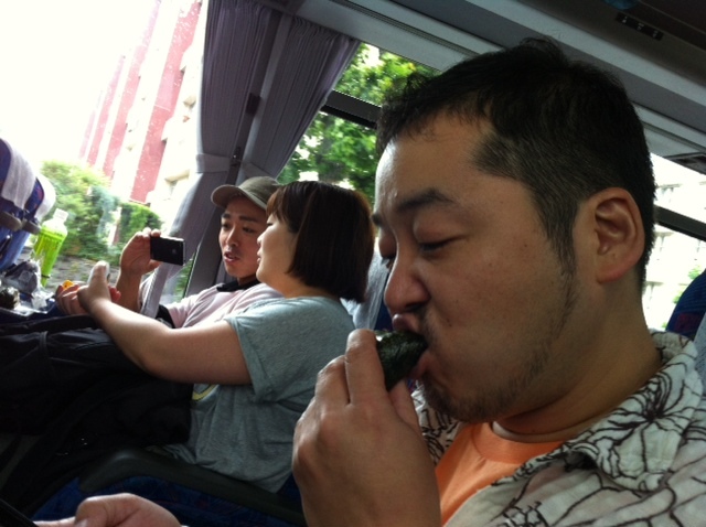おむすびが配られた。 談合坂パーキングエリアのごはんも気になる。 しかしBBQもある。 みんな笑顔の裏に いかに食べるかを悩んでいるのだ。
