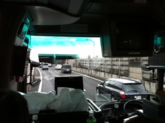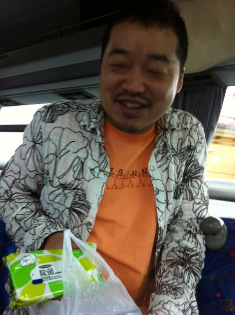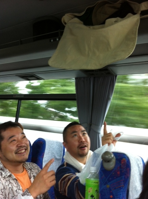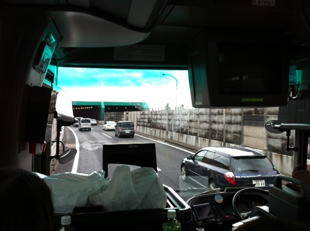 高井戸を過ぎ、 ようやく渋滞から抜けました。 やった!と思ったその瞬間、 べっかむ3の頭上からファサッと物音が。 武井さんのバッグがベロンと開いちゃったみたいです。 落ちたのはウェットティッシュでした。