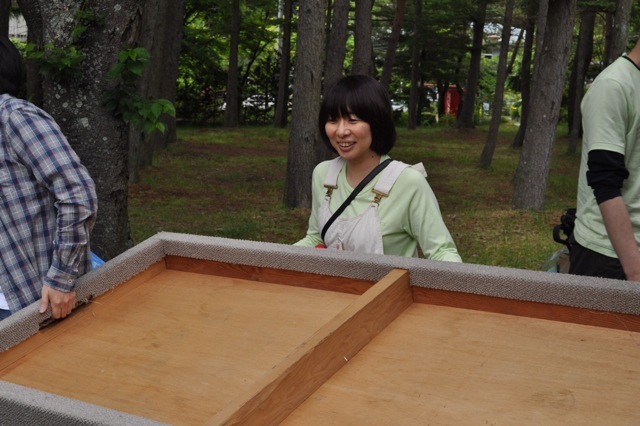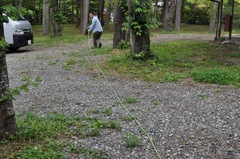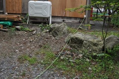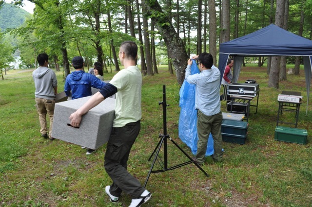 着いてから、いちばんの大仕事といえば ステージの設営でございます。 夜19時半あたりから開始予定の キャンプファイアーライブには、 なんと、田島貴男さんが登場してくださいます。 身内のりのささやかな企画とはいえ、 田島さんに歌っていただくのですから、 PA関係の機材は もちろんきちんと手配いたしました。