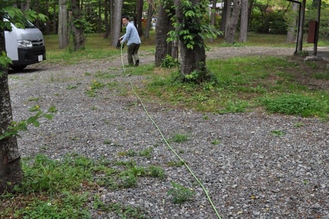 中継のための電源は、 場所をお借りしているホテルの施設から 長ーーいケーブルで引っ張ってまいります。 ケーブルの引き回しといえば、 この人です。 配線の鬼、ベイちゃん。