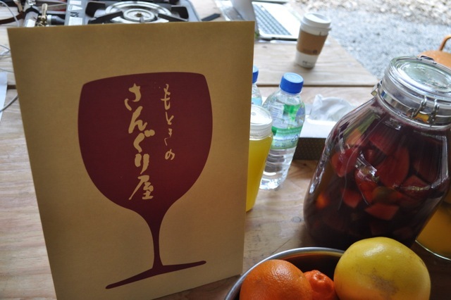 サングリアをふるまう店、 「さんぐり屋」。 こんな看板まで用意していたとは‥‥ もちろん、山口工務店のお手製でございます。