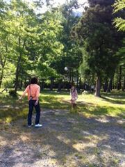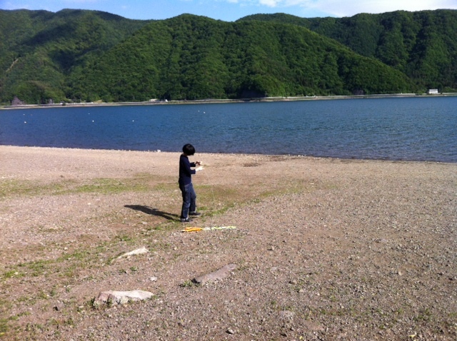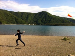凧をあげるというよりは 凧とたわむれる、ちひろちゃん。