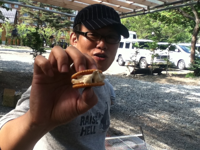 後発隊だったため 火おこしの現場に間に合わなかった 着火ブラザーズのイサワが マシュマロとリッツを取り出した!