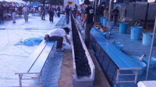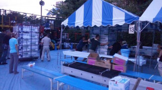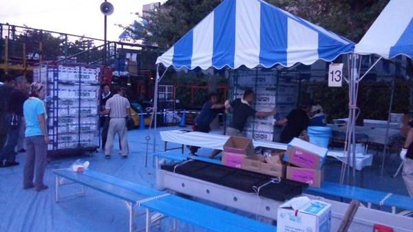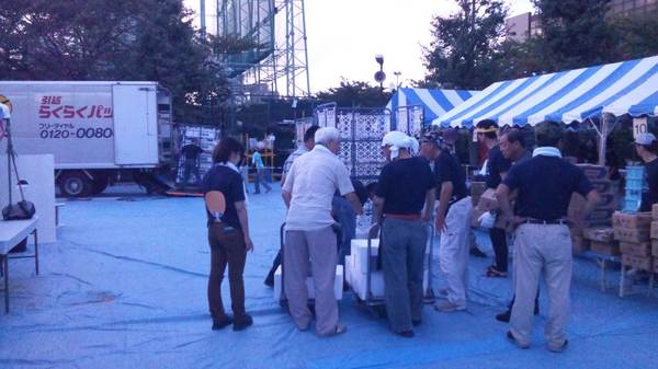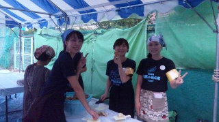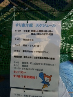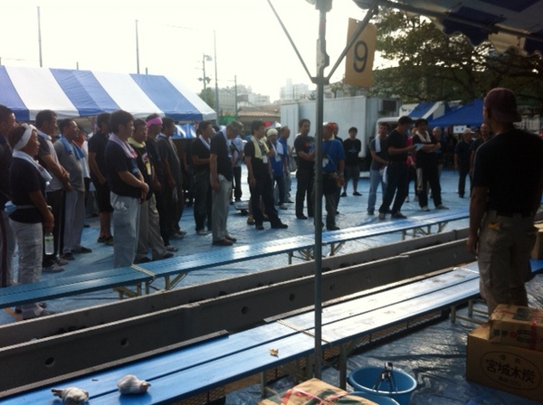 今日は焼き隊として参加します! まずは焼き隊だけで集まって朝会です。 焼き隊は13班にわかれて、 のべ100人以上います。 緊張してきたー!