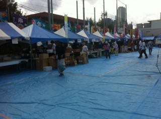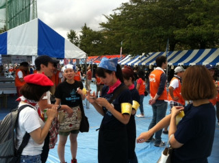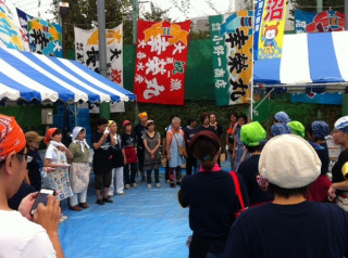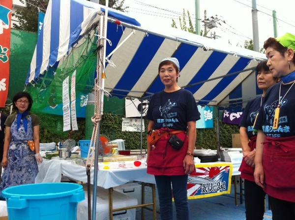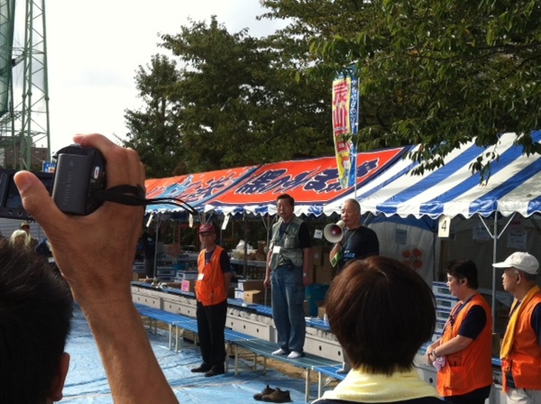 気仙沼AND目黒のおかみさんチームの 威勢のいい朝礼です。 まずはせい子さんのあいさつから。 「2年ぶりだねぇ」 とみなさん、うれしそう。