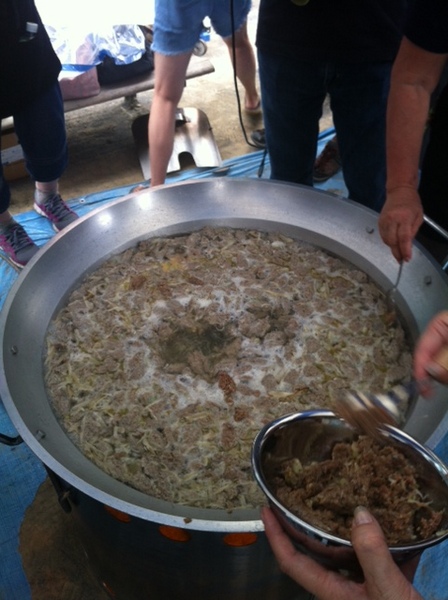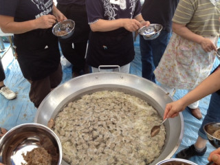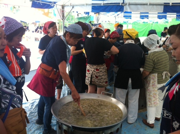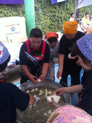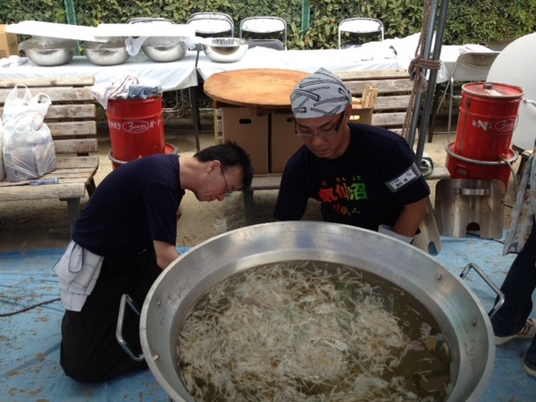 すり身汁がひと釜できたら、 みんなでお隣の釜へ移動して、 次の釜にすり身をいれていきます。