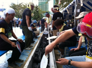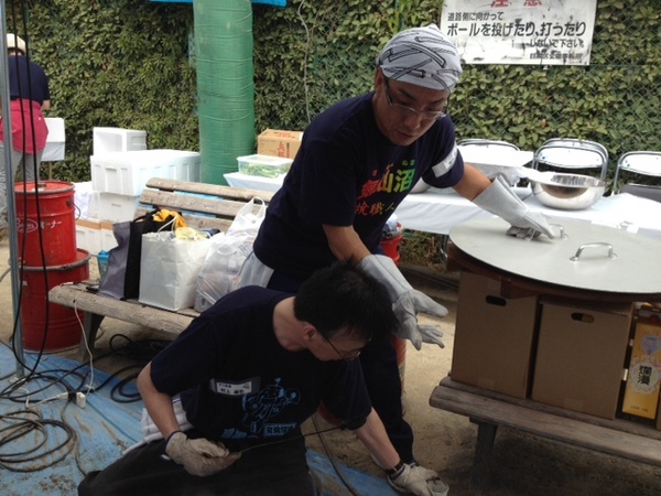 女性ばかりのさんますり身汁班ですが、 火の番は男性陣が。 汗がひかります。 かっこいいー!