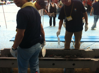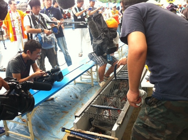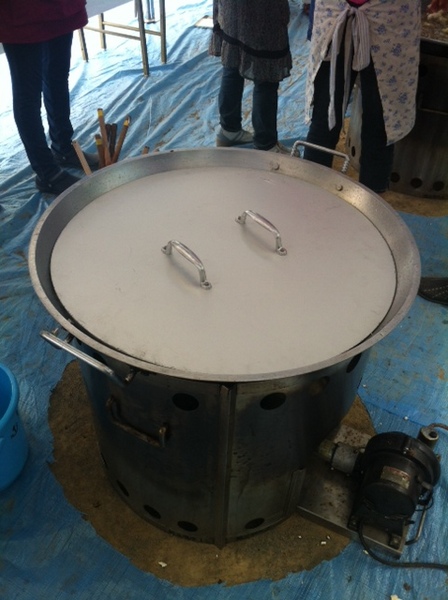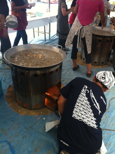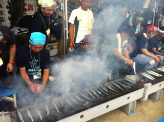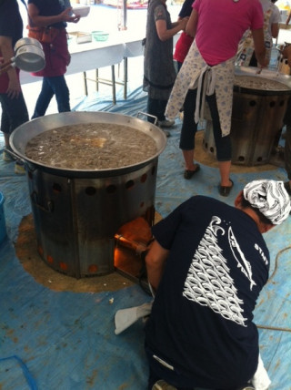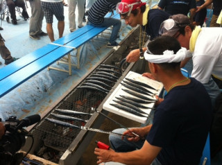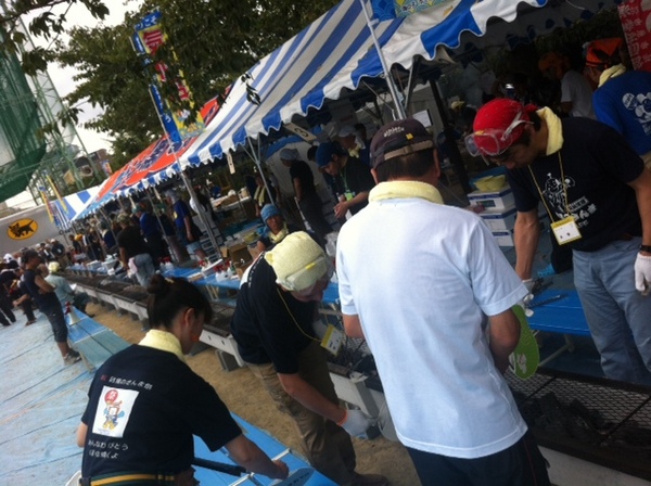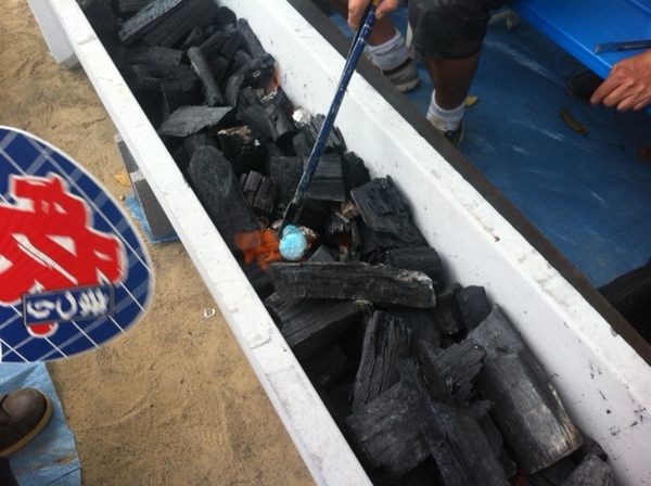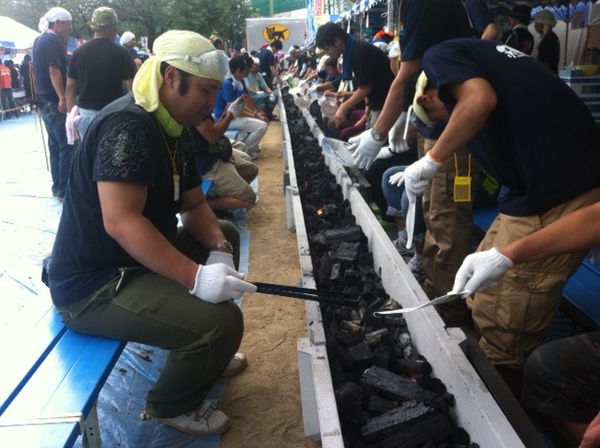 ちゃくちゃくと、 炭に点火中でございます。 焼き係のみなさん、いやぁもう、 暑そうです。 かくいうわたくしもね、ゆでだこのように なっております。 炭ってね、遠赤外線でしょ。 ちょっと離れたとこにいても 届くんだ、熱が。 こりゃ、さんまはたまらんぞ!