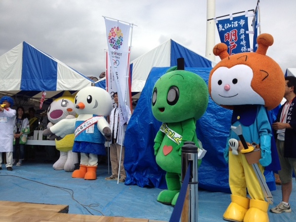 舞台裏にはゆるキャラ達が勢ぞろい! 右から、 ほやぼーや、かぼたん、 えーっとそのお隣は、、、?