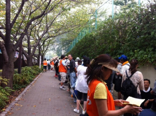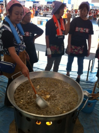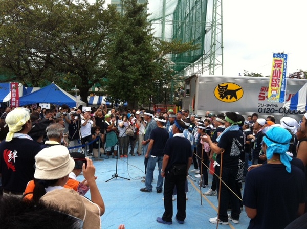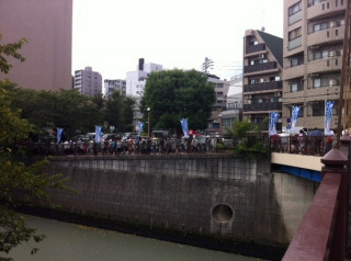 やる気まんまんで到着! わー! すごい人出! とりあえず偵察してみると、 さんまの列と 物産展の列があるようだ。