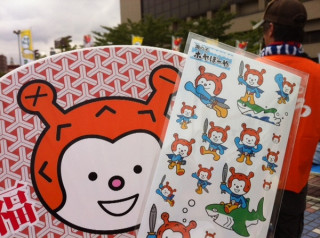 うちわもシールもあります。 ぜひ、兄さんたちを見つけて、 「ホヤぼーや」グッズを!