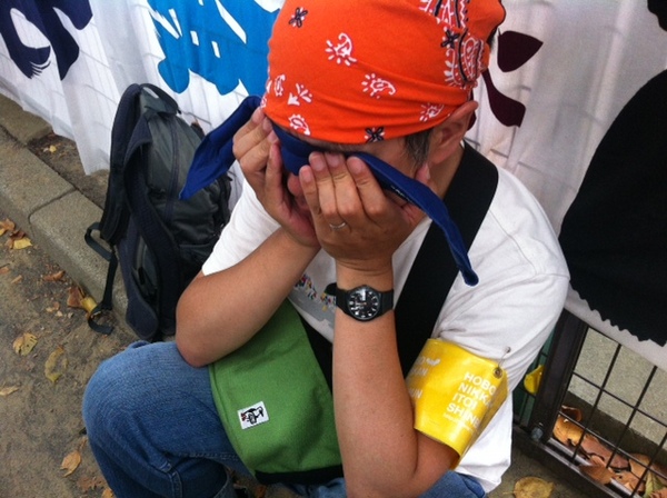 さんま、もくもくどんどん 焼かれていますよ。 そんななか、同僚はまだ泣いています。 バンダナを巻いているせいか、 「ペンション経営失敗」 という見出しが浮かびました。