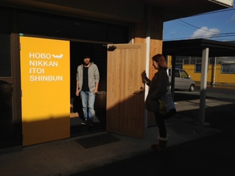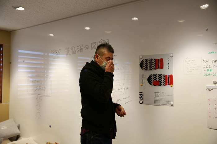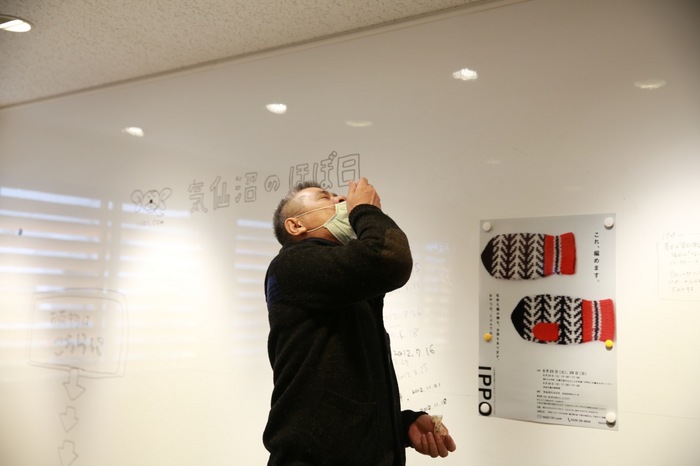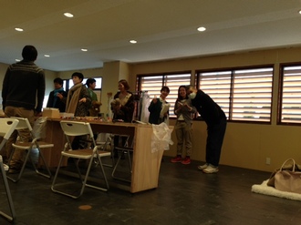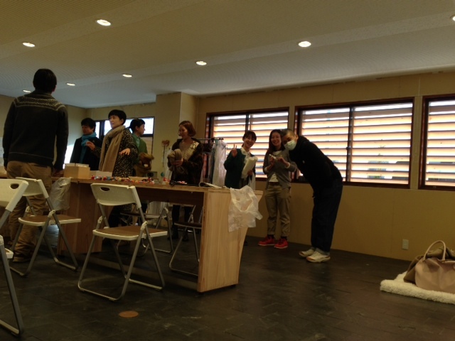 ミナ ペルホネンのスタッフの方が お召しになっているコートと 同じ布が入っていたので 「この布地が足りなくなったら ニッタさんのコートをチョキチョキして 使っちゃおっか」 と、皆川さん、軽いジョークの写真3枚目。 |