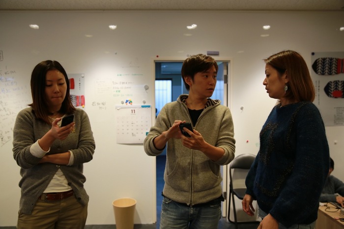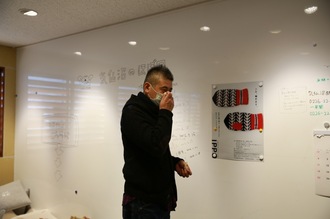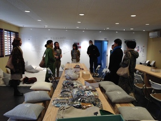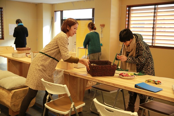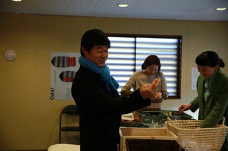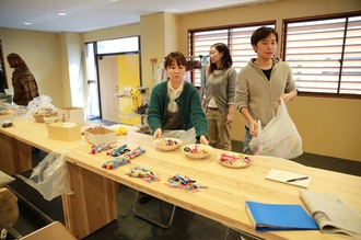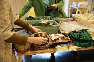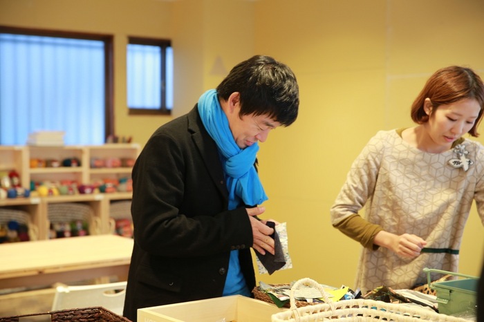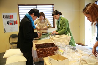 ただいま、皆川さんみずから、 ワークショップのテーブルに はぎれのデザインの偏りが出ないように 仕分けをしています。