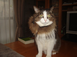 ===================主人にコートの襟のファーを外したのを巻いてもらい、ご満悦な猫。===================「似合うかニャ!」お似合いですよ。「そうかニャ。 似合うかニャ!」だから、お似合いですってば。