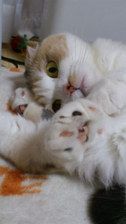 ===================うちの子も見てください。ささみ、です。冬はいつもヒーターの前でぬくぬく。ヒーターがついていなくても、そこにいます。目が口ほどに物を言うんです。ええ、かなりのプレッシャーです。慌ててヒーターをつけました。===================「オレさまの肉球を見ろニャ!」