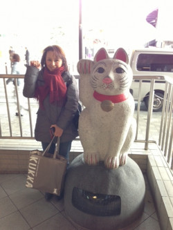 豪徳寺を出たところには梅が咲いていました。春ももうすぐです。そして招き猫が随所にいる豪徳寺商店街を通り、たどりついた駅前には招き猫発祥の地として大きな招き猫の像がありました。(りかさんが 小さいのではありません)はい、ニャーズ!