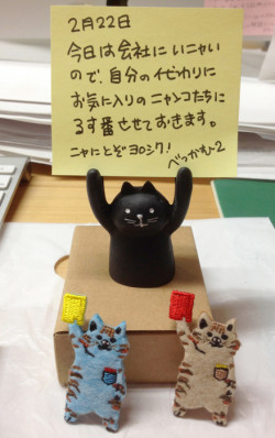 せっかくの「ネコの日」に用事ができてしまったので、本日は、肉球休暇をいただき、関西方面に向かうことになりました。ということで、昨晩、3匹のネコを机の上に置いておきました。まわりには、外国のニャンコも。だれにも気づかれにゃいと、完全にひとりあそびににゃっちゃうんで、みずから投稿しておきます。またたび、たび、チェックして、できたら投稿する予定。ニャにとぞ、ヨロシク! ーべっかむ2(にゃん)ー