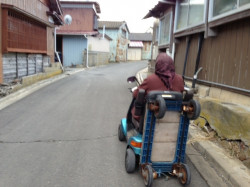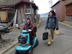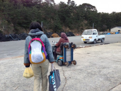 田代島のニャユミとスガニャ、島に降り立ったとたん、おかあさんのお出迎え。今夜お世話になる、民宿のおかみさんです。船を降りたのはふたりだけだったので、すぐに声をかけてくださいました。「いまは寒くてね、あとは、震災の復興工事のせいでネコは浜にはいないのさー」とのこと。おかあさんの案内で、宿までの坂道をのぼります。おかあさんの車はこれでけっこう速いので、我々、ちょっと駆け足です。