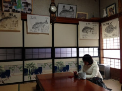 到着してさっそく、ネコスト中継中のスガノさん。今回きている田代島は、釣り船を出してもらったりもできるらしいです。そこかしこに魚拓、神棚にはエビスさま。船の写真も飾ってあります。この島のネコたちは、やっぱり魚が主食なのかなぁ。