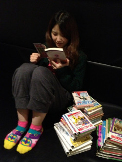 たくさんの蔵書のなかから、選りすぐりの精鋭たちをそろえて一息つく間もなくさっそく読みはじめたにゃーたか。おーい、おーい。‥‥無視。静かにじぶんの世界に入って行きましたにゃ。手にしているのは『ねこ・ねこ・幻想曲』。くつしたにも目が行きますにゃ。