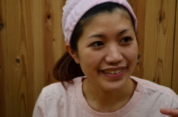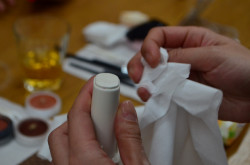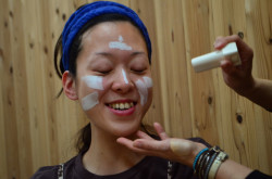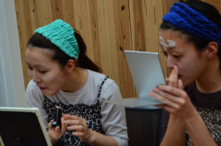 3人は塗り始めました。まずは、ファンデーションを塗っていきます。塗りつぶすように塗ります。なんつっても、人間の顔をネコにしようっていうんだからにゃ。ええ、お気づきですか?3人には、段階があることを。一人は完全な白塗りになりそうですね。そして、はどうするんにゃ?それにしても、若さって、いいなあ。(ちょっと年かさのニャギの心情の吐露)