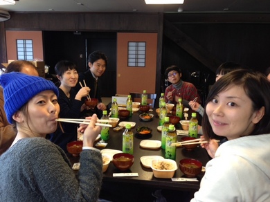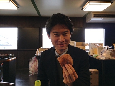 デザートは「紅梅」さんの「あげあんぱん」です。気仙沼のこどもはこれがおやつにでてくると大喜びをするらしいです。明日はあんこを煮るわけですが、あんこをこよなく愛するわれわれはもちろん!いただきます!写真は「とらや」の松平さんと、本田さん。