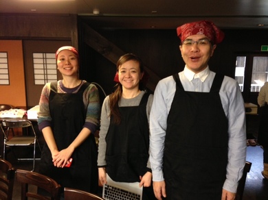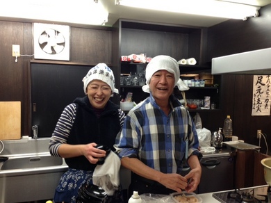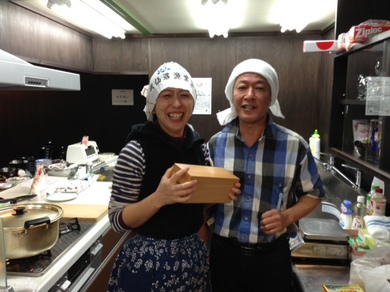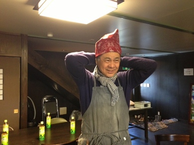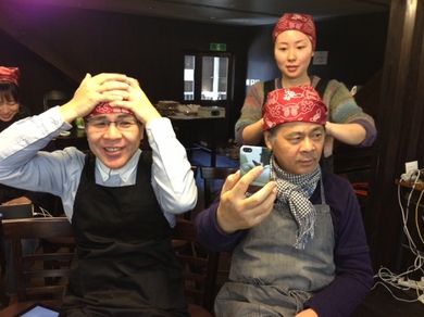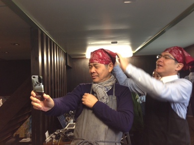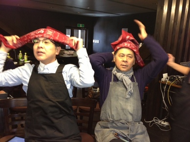 大統領特別エプロン(ヒカリエで購入)を装着!そしてユニフォームのバンダナを。「決まらない!」「山下さんもおかしいから なおしたらいい。」さゆみちゃんにも手伝ってもらって、ふたりはバンダナを巻きます。巻きますとともに、気合いが入ります。あんこぉぉぉぉ〜!巻いたあとに大統領は、自分撮りをして、このようにツイート。