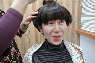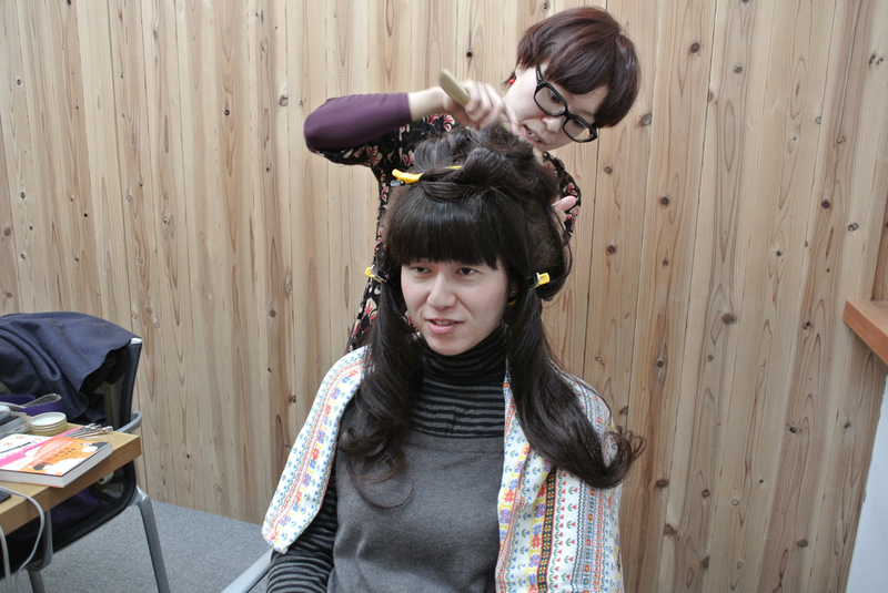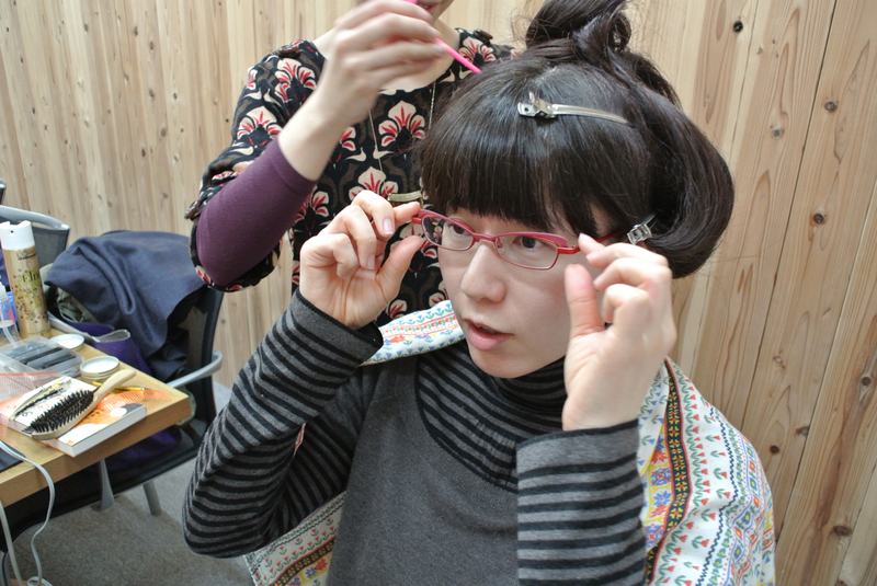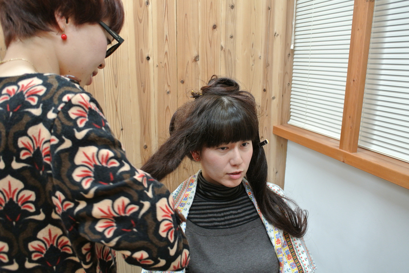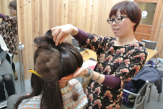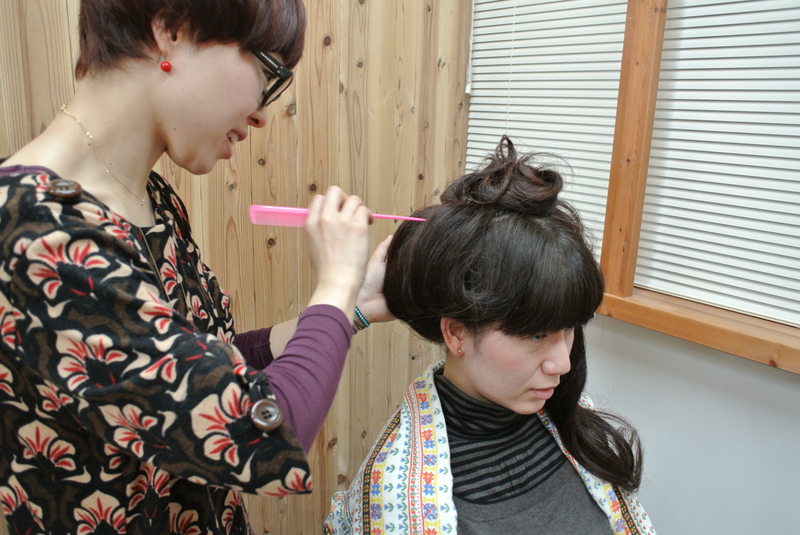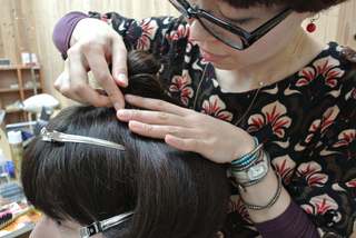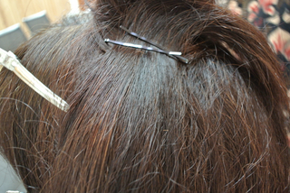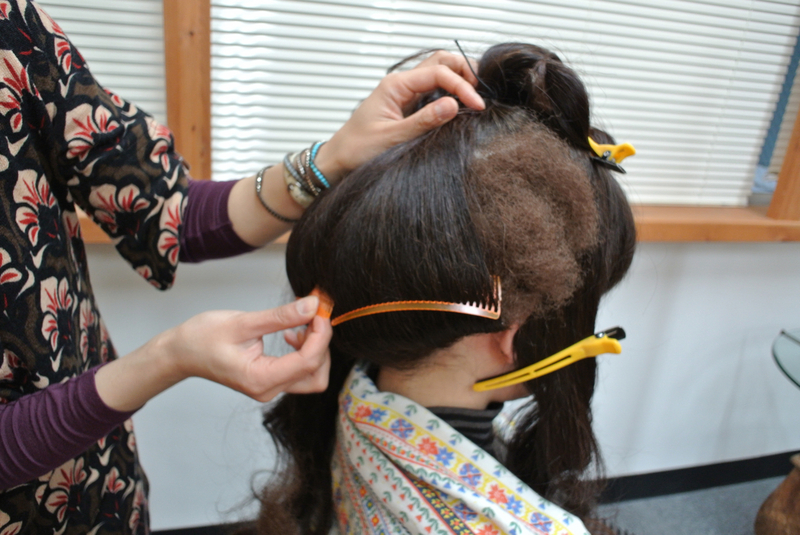 頭頂部でピンをとめて、