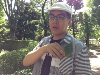 ふむふむ。 葉っぱはぎざぎざ。 葉脈が美しく入ります。 今日の収穫を祈りつつ 虫食いの跡のある葉っぱはを 一枚いただいて 胸にさす山下哲である。
