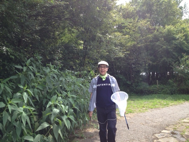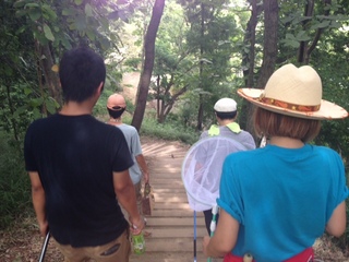 これから、小林さんと 園内をタマムシさがしに出かけます。 あ、ちなみに この公園では採集は禁止。 我らが持っている網は 持っているだけ、 という状況です。 |