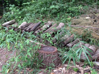 さて、小林さんオススメの タマムシポイントへ。 タマムシは倒木に 卵を産みつけにくるので、 炭焼き小屋に積んである まきに居たりしないかな! |