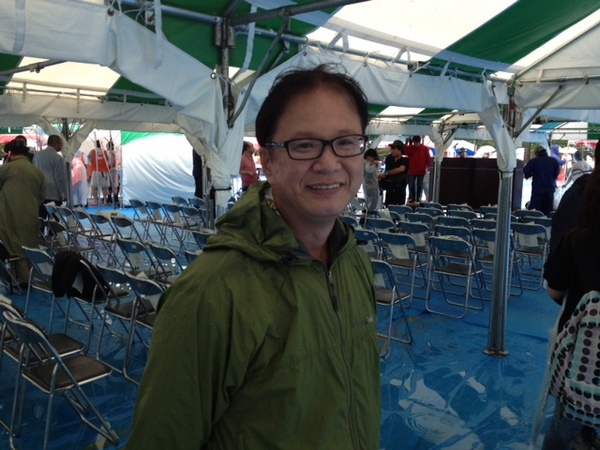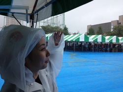 強くなったり、弱まったりの中 三陸新報のかずちゃん情報によると 1000人ほどのお客様が 並んでいらっしゃるとのこと。 後ろでは、 開会式の準備が進んでおります。 |