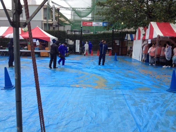 お客様が歩きずらくないように さんま祭り会場は 一面ブルーシートが貼られています。 もうすぐ開会式。 待っていてくださるお客様のために ブルーシートの貼り直し。 並んでいらっしゃる皆様、 もう焼き台の準備も万端です! |
