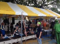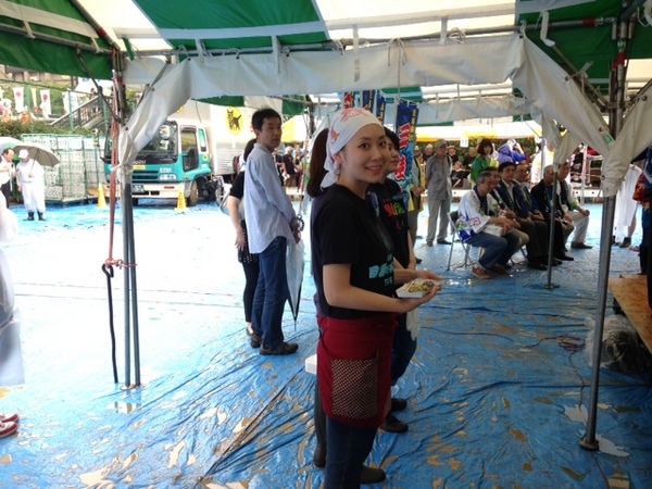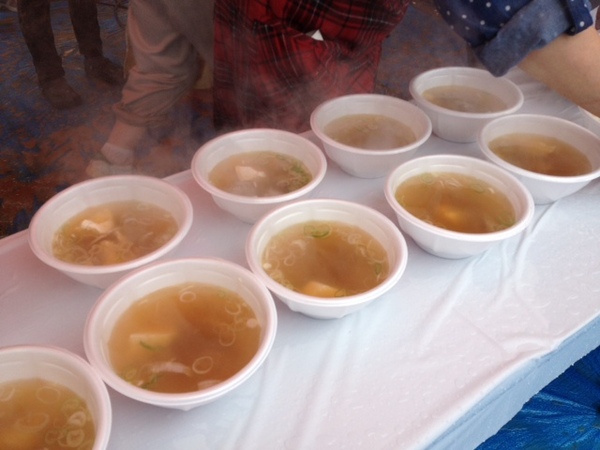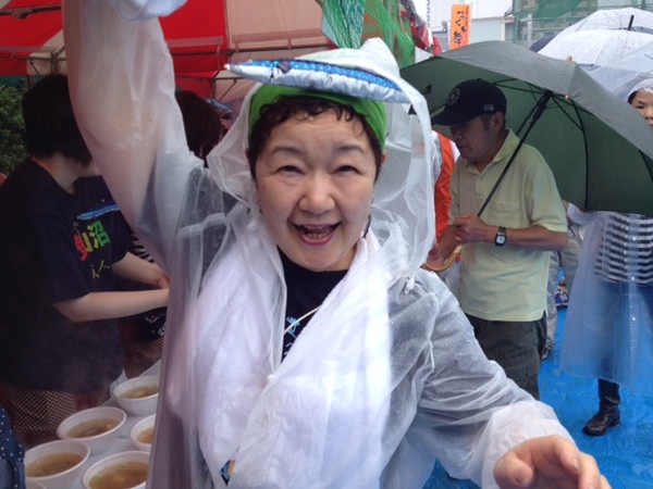 焼きさんまの反対側では、 すり身汁が どんどん販売されております。 もう一人のすり身汁隊長、 松井会長の奥様えみこさんも お待ちしています! |