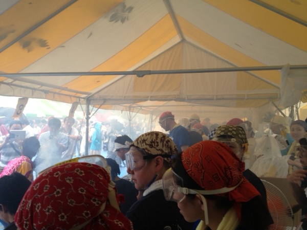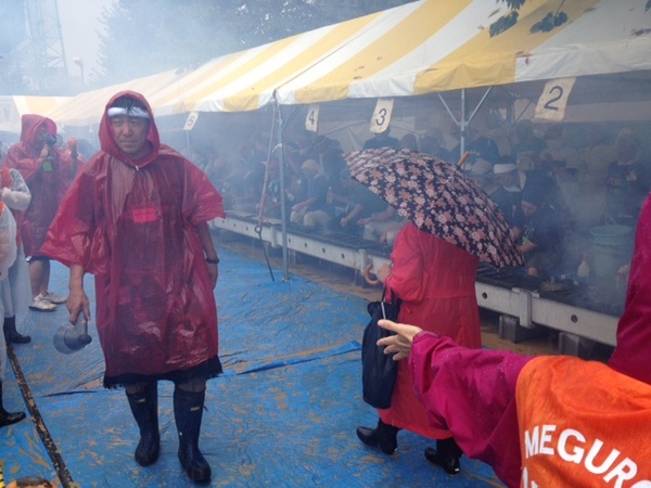 食べる場所の準備もできて、 焼きが本格的に。 煙がすごい! |