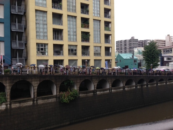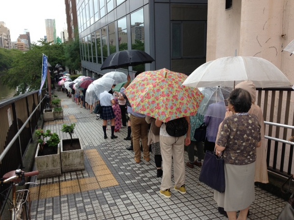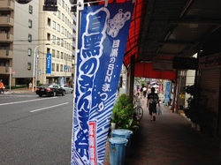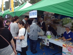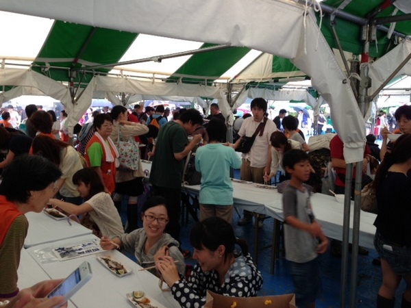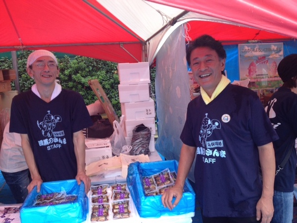 斉吉さんのブースで 待っていらっしゃいますよ。 「梶原くん、笑顔、笑顔!」 すみお社長の笑顔も 素敵です。 別の現場にむかった冨田から 「さんま待ちの列が 権之助坂まで続いてるよー」 と、連絡が。 おおお!すごい! |