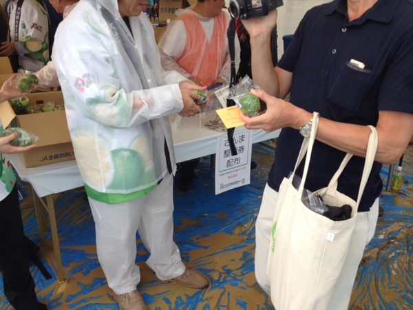 さんまの整理券配布場所では、 お客様にかぼすが プレゼントされています。 「大変ながらく お待たせいたしました! 今年も気仙沼の皆さんが 用意してくださった 美味しいさんまが 皆様をお待ちしています」 目黒側の実行委員会の方の声が 響きます。 |