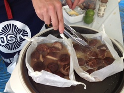 大分のブースでは、 かぼすや鶏めし、 麦焼酎などを販売しております。 ぐつぐつ、音がするので のぞいてみると 大分の特産品「どんこ」を バター焼きに! じゅるっ。 ひとつくださーい! |