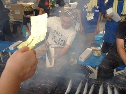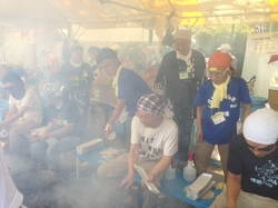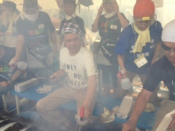 社長が焼いてますが 自然に焼き手に溶け込んでます。 気仙沼の菅原市長も いらっしゃいました。 |
