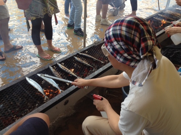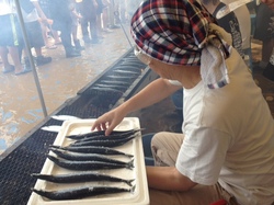 長い列に並んでくださったお客様、 お待たせしました。 さぁ、さぁ、気仙沼の 美味しいさんまをどうぞ! |