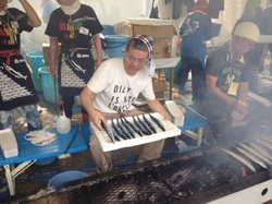 炭にピュッと水をかけながら 糸井がさんまを焼いております。 まだまだやきますよー。 こちらで、まだまだ 生さんまも待機中。 |