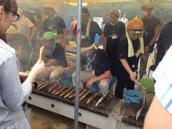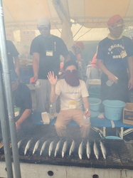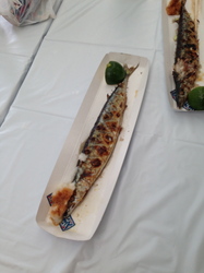 会場にたどりつくと、 さんまを焼く人たちの姿がありました。 今年は雨だからでしょうか、 焼く人たちの頭上に 雨よけのテントがあって 煙が、たいへん充満していました。