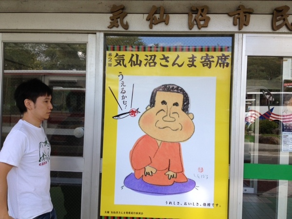 南伸坊さんに描いていただいた 志の輔さんが、 市民会館で、お出迎えです。 |