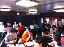 ぎこちない包丁さばきで みなさんひとり一尾ずつ、 さんまをおろします。 みなさん、一所懸命に。 一尾おろされるたびに、拍手。